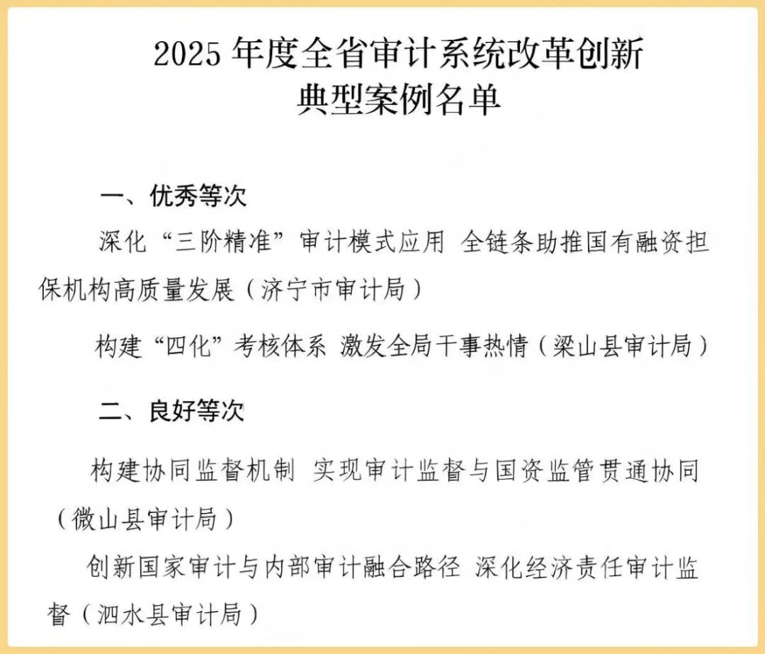 | 济宁市审计机关4项改革创新事项入选全省审计改革创新典型案例 |